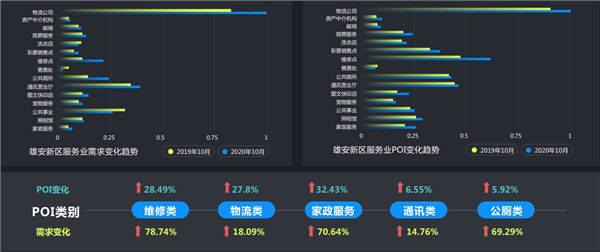 家政、通訊、公廁等POI數量則分別增長了32.43%、6.55%、5.92%。這些從側面反映出,雄安新區(qū)建設大軍的涌入,帶動了當地消費需求的增長和消費能力的提升。