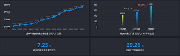 雄安對外骨干路網(wǎng)也進(jìn)入了實(shí)質(zhì)性建設(shè)階段,路網(wǎng)密度整體上升。2020 年10月,雄安主干路網(wǎng)里程對比2019年10月提升了7.25%。衛(wèi)星遙感影像顯示,榮烏高速和京雄高速以“南北縱橫”的形態(tài)清晰呈現(xiàn),雄安新區(qū)的主干路網(wǎng)也已呈現(xiàn)出初步輪廓,京雄城際鐵路已經(jīng)全線貫通。此外,雄安的公交系統(tǒng)逐步完善,2020年的公交里程較2019年同期增加了29.26%。