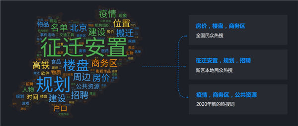 《報(bào)告》顯示,房價(jià)、規(guī)劃、建設(shè)、招聘和高鐵是過去兩年全國民眾對雄安的持續(xù)關(guān)注熱點(diǎn)。與2019年相比,“商務(wù)區(qū)”首次進(jìn)入全國熱門搜索詞,這反映出越來越多的人開始考慮到雄安新區(qū)開展相關(guān)商業(yè)活動的可能。雄安新區(qū)本地民眾的關(guān)注重點(diǎn),則保持了相對穩(wěn)定,“搬遷”和“規(guī)劃”等主題詞近兩年持續(xù)受到關(guān)注。此外,“疫情”和“公共資源”等新的熱點(diǎn)詞開始受到雄安新區(qū)本地民眾的關(guān)注,體現(xiàn)了雄安新區(qū)當(dāng)前建設(shè)階段新的特點(diǎn)。
