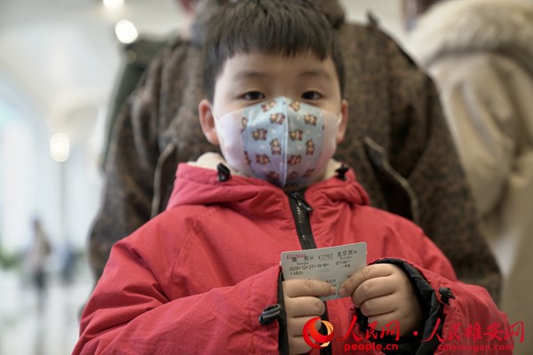 2020年12月27日上午,京雄城際鐵路全線開通運(yùn)營,一位小朋友手里拿著雄安到北京西的車票。人民網(wǎng) 宋燁文攝