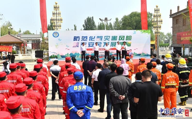 在全國(guó)防災(zāi)減災(zāi)日宣傳活動(dòng)現(xiàn)場(chǎng),戴泊生向安新小學(xué)頒發(fā)省級(jí)地震科普教育示范學(xué)校牌匾,劉樹軍向東淀頭村頒發(fā)全國(guó)綜合減災(zāi)示范社區(qū)牌匾,兩位領(lǐng)導(dǎo)共同向雄州救援隊(duì)、雄風(fēng)救援隊(duì)、藍(lán)天救援隊(duì)、美團(tuán)代表隊(duì)等新區(qū)安全宣傳志愿者隊(duì)伍代表授旗。中國(guó)人民財(cái)產(chǎn)保險(xiǎn)股份有限公司雄安分公司籌建負(fù)責(zé)人張友林為活動(dòng)致開幕詞,中國(guó)福利基金會(huì)支持雄安公益基金執(zhí)行主任、北京支持雄安產(chǎn)業(yè)發(fā)展促進(jìn)會(huì)常務(wù)副會(huì)長(zhǎng)兼秘書長(zhǎng)彌雪向雄安新區(qū)捐贈(zèng)了高空細(xì)水霧滅火消防車。