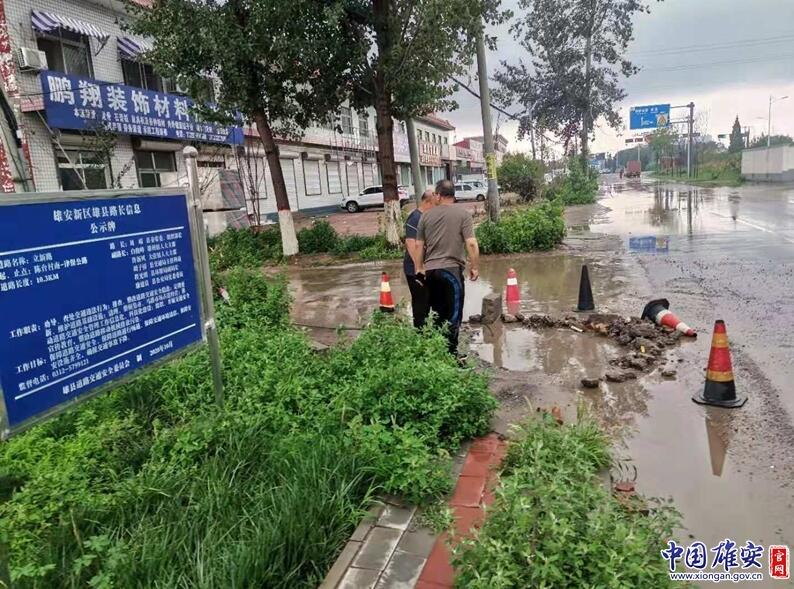 雄縣交通運(yùn)輸局相關(guān)工作人員對(duì)路面坑洼處進(jìn)行圍擋。中國(guó)雄安官網(wǎng)發(fā)
