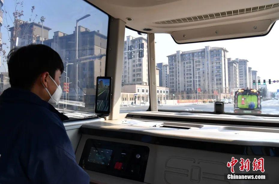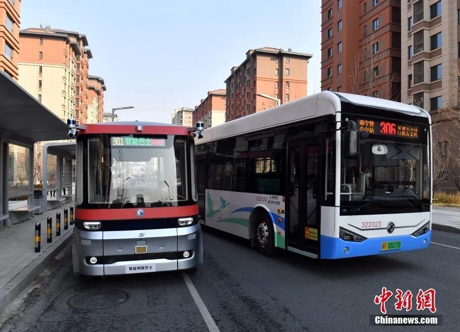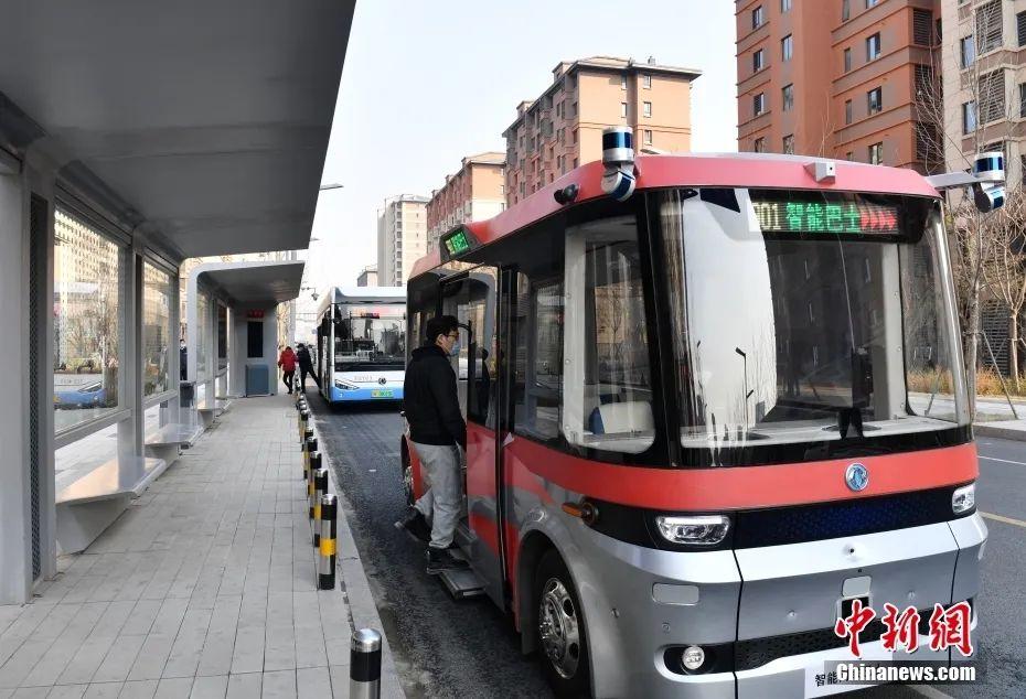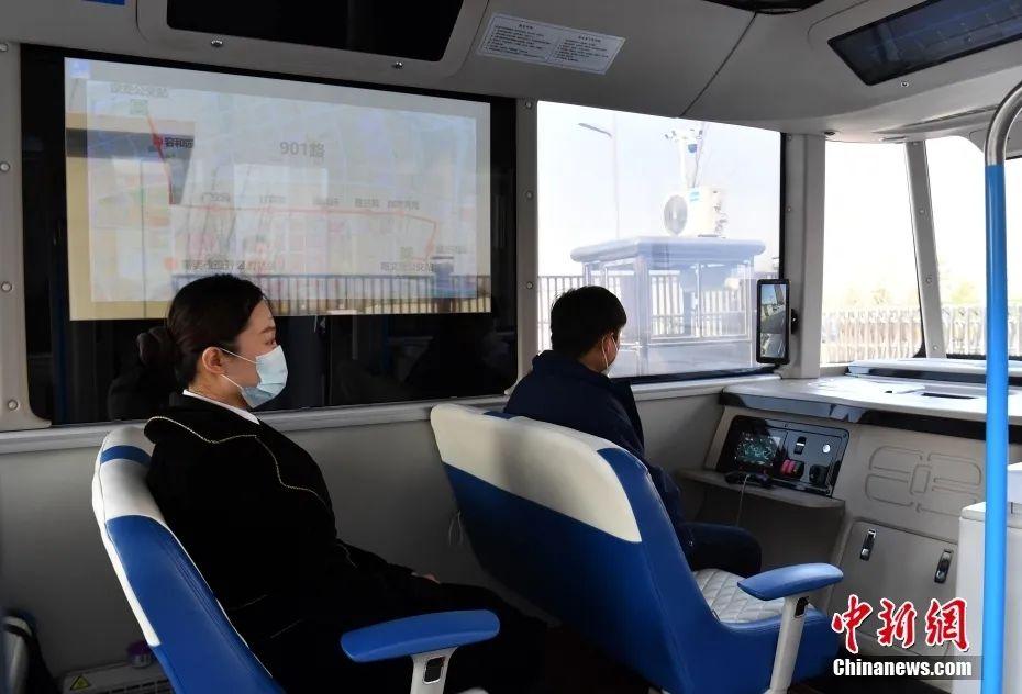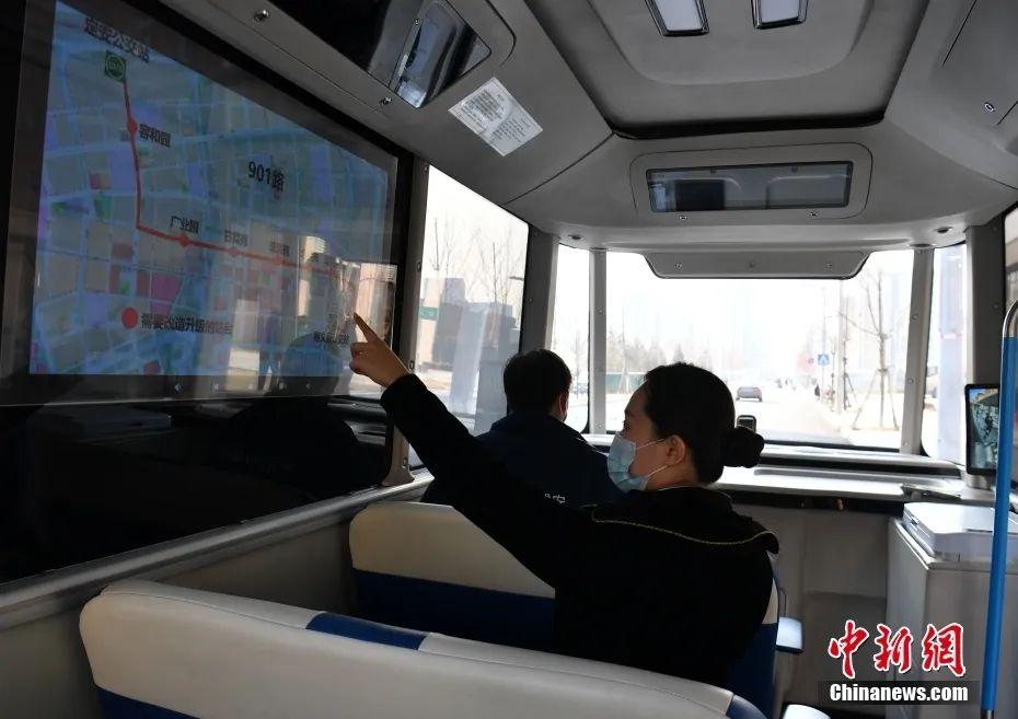 智能網(wǎng)聯(lián)巴士901線測(cè)試車輛準(zhǔn)備發(fā)車。中新社記者韓冰 攝