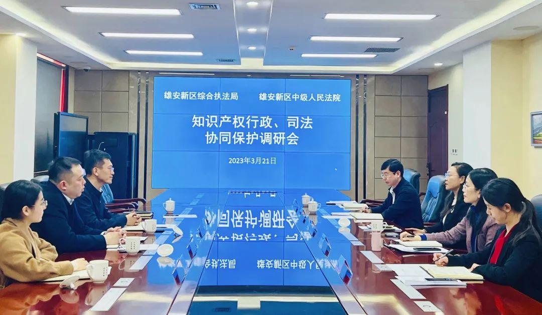 3月21日,在雄安中院與綜合執(zhí)法局開(kāi)展的知識(shí)產(chǎn)權(quán)行政、司法協(xié)同保護(hù)調(diào)研會(huì)上,雄安中院黨組副書(shū)記、副院長(zhǎng)張曉梅介紹了雄安中院開(kāi)展知識(shí)產(chǎn)權(quán)司法體制機(jī)制改革,優(yōu)化全省知識(shí)產(chǎn)權(quán)案件管轄布局,便利當(dāng)事人參與訴訟,主動(dòng)了解、回應(yīng)知識(shí)產(chǎn)權(quán)司法關(guān)切和需求,提升司法服務(wù)保障創(chuàng)新發(fā)展精準(zhǔn)度,與京津冀三地省級(jí)知產(chǎn)行政保護(hù)中心建立的京津冀知識(shí)產(chǎn)權(quán)快速協(xié)同保護(hù)機(jī)制,為創(chuàng)新主體提供多元便利的知識(shí)產(chǎn)權(quán)解紛途徑等工作情況。李聰介紹了中國(guó)(雄安)知識(shí)產(chǎn)權(quán)保護(hù)中心和雄安新區(qū)知識(shí)產(chǎn)權(quán)運(yùn)營(yíng)中心的組織架構(gòu)及運(yùn)行、建設(shè)情況。雙方確定了協(xié)同機(jī)制聯(lián)絡(luò)人,并就雄安新區(qū)知識(shí)產(chǎn)權(quán)保護(hù)舉措進(jìn)行了深入交流。雙方一致表示,要以此前的良好合作關(guān)系為基礎(chǔ),在“4?26”知識(shí)產(chǎn)權(quán)宣傳周期間攜手打造雄安知識(shí)產(chǎn)權(quán)保護(hù)品牌,在精準(zhǔn)對(duì)接雄安新區(qū)創(chuàng)新主體的司法需求方面開(kāi)展聯(lián)合工作,提升協(xié)同保護(hù)質(zhì)效。