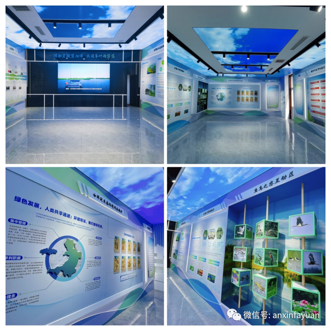 該基地坐落于安新縣旅游東路白洋淀環(huán)境資源法庭院內(nèi),毗鄰景區(qū)碼頭,地理位置優(yōu)越,四周皆為林蔭植被,環(huán)境優(yōu)美。內(nèi)部采用了先進的聲、光、影等多媒體技術(shù),更好地呈現(xiàn)白洋淀人文環(huán)境、生態(tài)治理、生物多樣性司法保護、庭審現(xiàn)場實況等內(nèi)容,集理念傳播、成果展示、法治教育、文化推廣等功能于一體,讓觀者在實地可同時沉浸式、互動式、體驗式感受生態(tài)保護司法文化,展示白洋淀生態(tài)治理和環(huán)境資源司法保護事業(yè)取得的新成就,提升人民群眾的環(huán)保意識和法治理念,打造安新法院法治文化新名片,在實踐中將新時代人民法院文化融入工作全過程。
