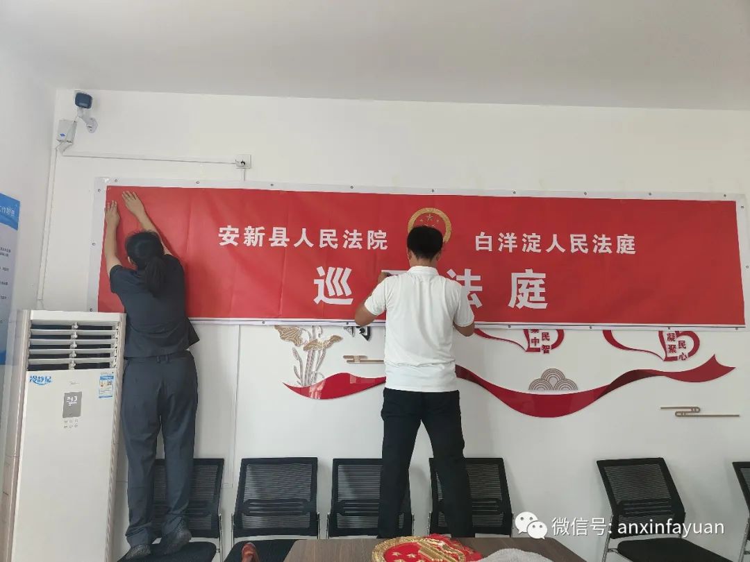 白洋淀人民法庭的干警們在圈頭鄉(xiāng)群眾工作中心懸掛國徽、拉條幅,架設(shè)移動數(shù)字法庭設(shè)備,迅速搭建起一個簡易的巡回法庭 攝影:王杰