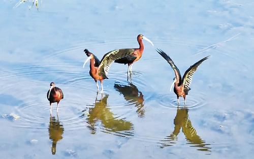 彩鹮是有著“東方寶石”之稱的朱鹮的近親,因?yàn)樗挠鹈谔?yáng)下會(huì)閃爍多彩金屬光澤,所以叫彩鹮?!吨袊?guó)瀕危動(dòng)物紅皮書(shū)》曾一度宣布彩鹮在我國(guó)絕跡。彩鹮在河北省雖有分布,但一次拍攝到6只“扎堆”出現(xiàn),卻也十分罕見(jiàn)。