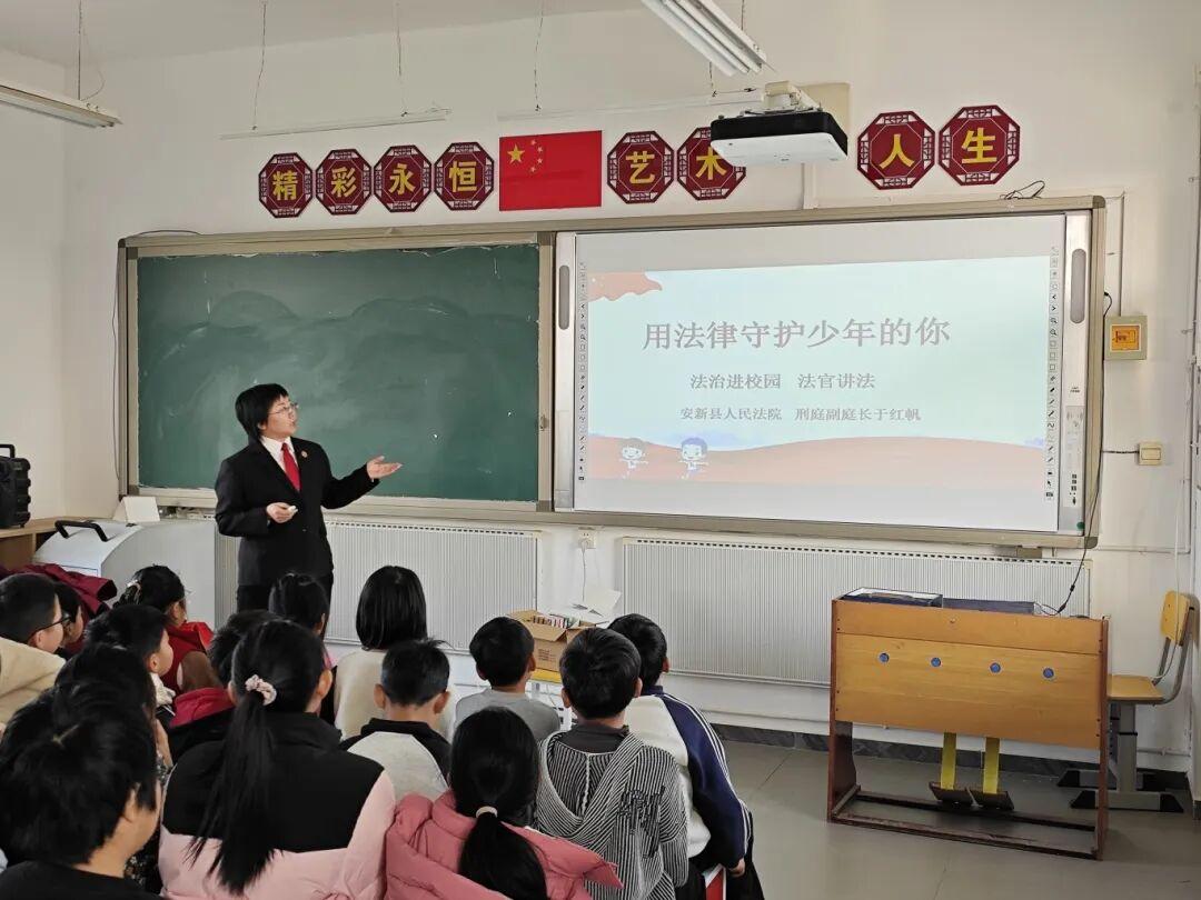 走進(jìn)安新南六小學(xué)、大趙莊小學(xué),法官們結(jié)合青春期學(xué)生的心理特點(diǎn)與成長需求,以通俗的語言、真實(shí)的案例,生動講解防范校園欺凌、性侵害、網(wǎng)絡(luò)沉迷及電信詐騙等關(guān)鍵知識。在五星紅旗下,同學(xué)們高舉右拳,莊嚴(yán)宣誓:“不做殘忍的欺凌者、不做冷漠的旁觀者、不做沉默的受害者,團(tuán)結(jié)同學(xué)、友善待人!”鏗鏘誓言回蕩校園,不僅將法治信念深深鑄入童心,也將整場活動推向情感的高潮。