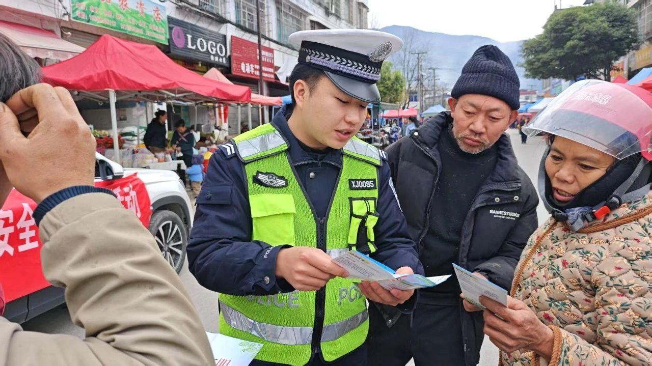 在農(nóng)村趕集日,宣傳民警來到集市中心,設(shè)置宣傳點(diǎn),擺放交通安全宣傳展板,并向群眾發(fā)放宣傳手冊。與此同時(shí),為助力群眾合法合規(guī)上路行駛,民輔警還現(xiàn)場詳細(xì)講解摩托車上牌辦證的規(guī)范流程,引導(dǎo)群眾主動(dòng)遵守交通法規(guī)。