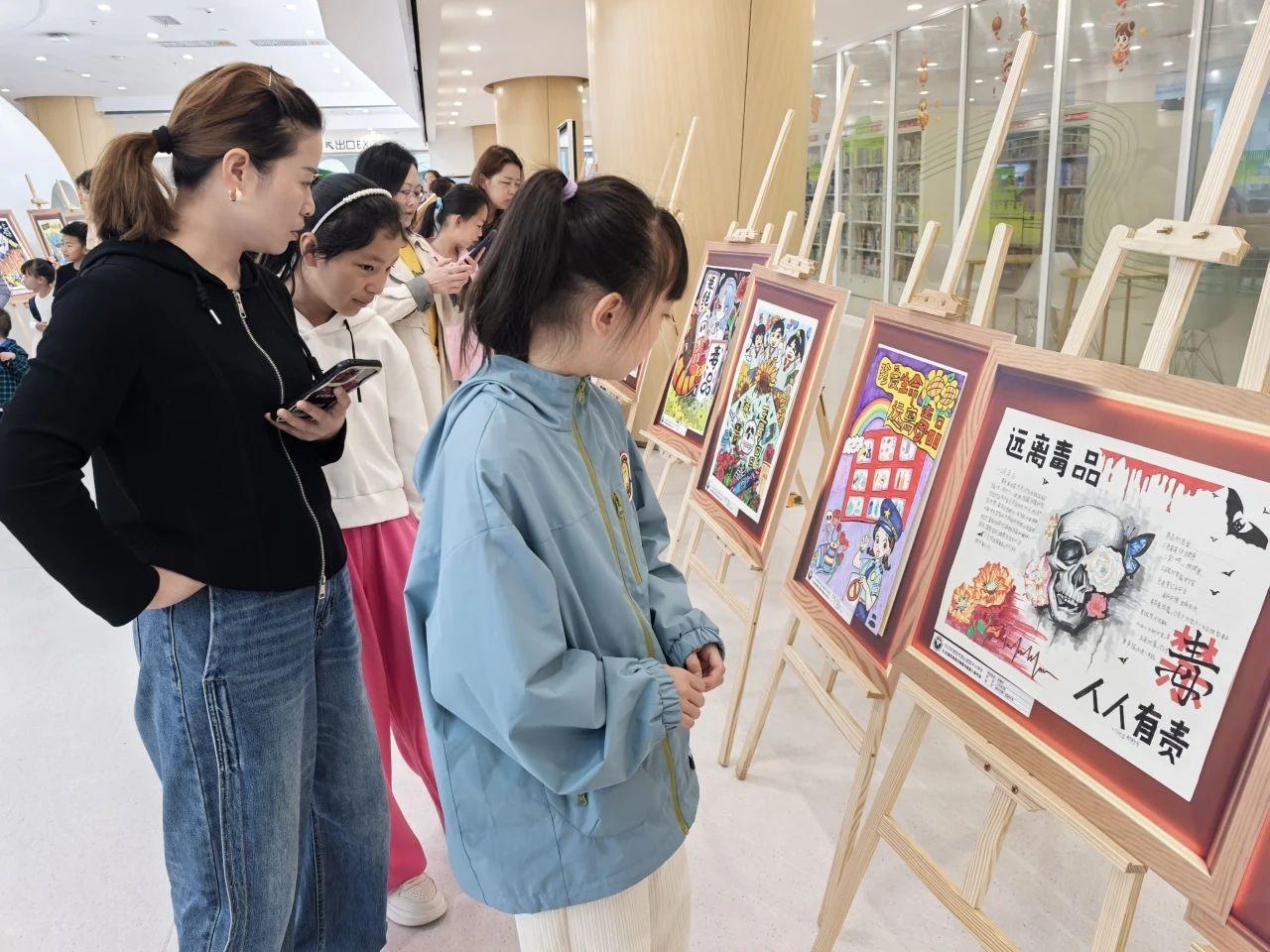 圖書館內(nèi),百余幅來自觀山湖區(qū)各中小學(xué)生的優(yōu)秀禁毒主題書畫作品精彩亮相,稚嫩的畫筆與真誠(chéng)的色彩勾勒出孩子們對(duì)無毒未來的堅(jiān)定向往,向社會(huì)傳遞純凈而有力的禁毒宣言。