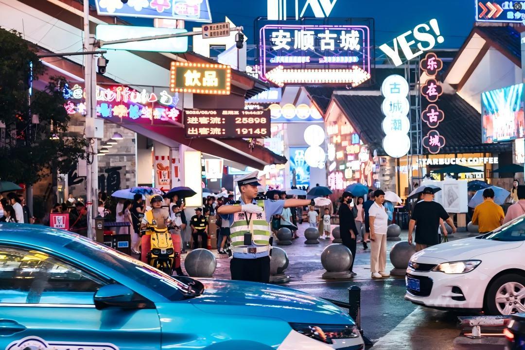 如果說景區(qū)交通管理是安順交警的常規(guī)動作,那么中心城區(qū)面臨的挑戰(zhàn)則是全新的“考題”。隨著“21℃的城市·360度的人生”城市IP品牌的打響,以安順古城、虹山湖休閑生活區(qū)為首的城區(qū)景點和大街小巷遍布的特色小吃,讓許多游客從“過境游”向“深度游”、從“景點打卡”向“避暑度假”轉(zhuǎn)變,許多游客整個暑期都在安順度過,感受迷人風光、深厚底蘊與夏日清涼的獨特魅力。今年7月起,安順古城單日平均接待游客10萬人次,最高峰達到18萬人次,這展示了安順一流旅游城市建設(shè)的成果,但是在道路資源變化不大的情況下,群眾日常出行疊加游客自駕出行需求,讓城市交通流量大幅增加,給道路交通管理帶來了極大挑戰(zhàn)。