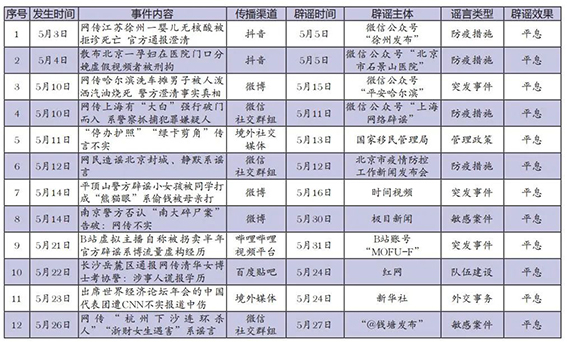 5月網絡涉法謠言辟謠榜單共梳理、匯總12起熱點謠言事件,圍繞謠言持續(xù)時間、傳播渠道、產生地域、所涉類型以及辟謠平臺等維度綜合分析,篩選兩起關注度較高、具有典型意義的案例研判,以期為網絡辟謠工作提供參考借鑒。