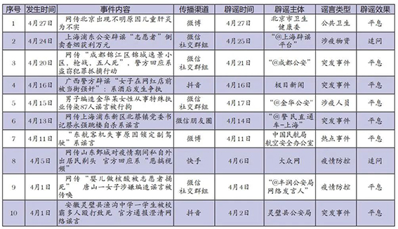 4月網絡涉法謠言辟謠榜單共梳理、匯總10起熱點事件,圍繞謠言持續(xù)時間、傳播渠道、產生地域、類型以及辟謠平臺等維度綜合分析,篩選兩起關注度較高、具有典型意義的案例研判,以期為網絡辟謠工作提供參考借鑒。