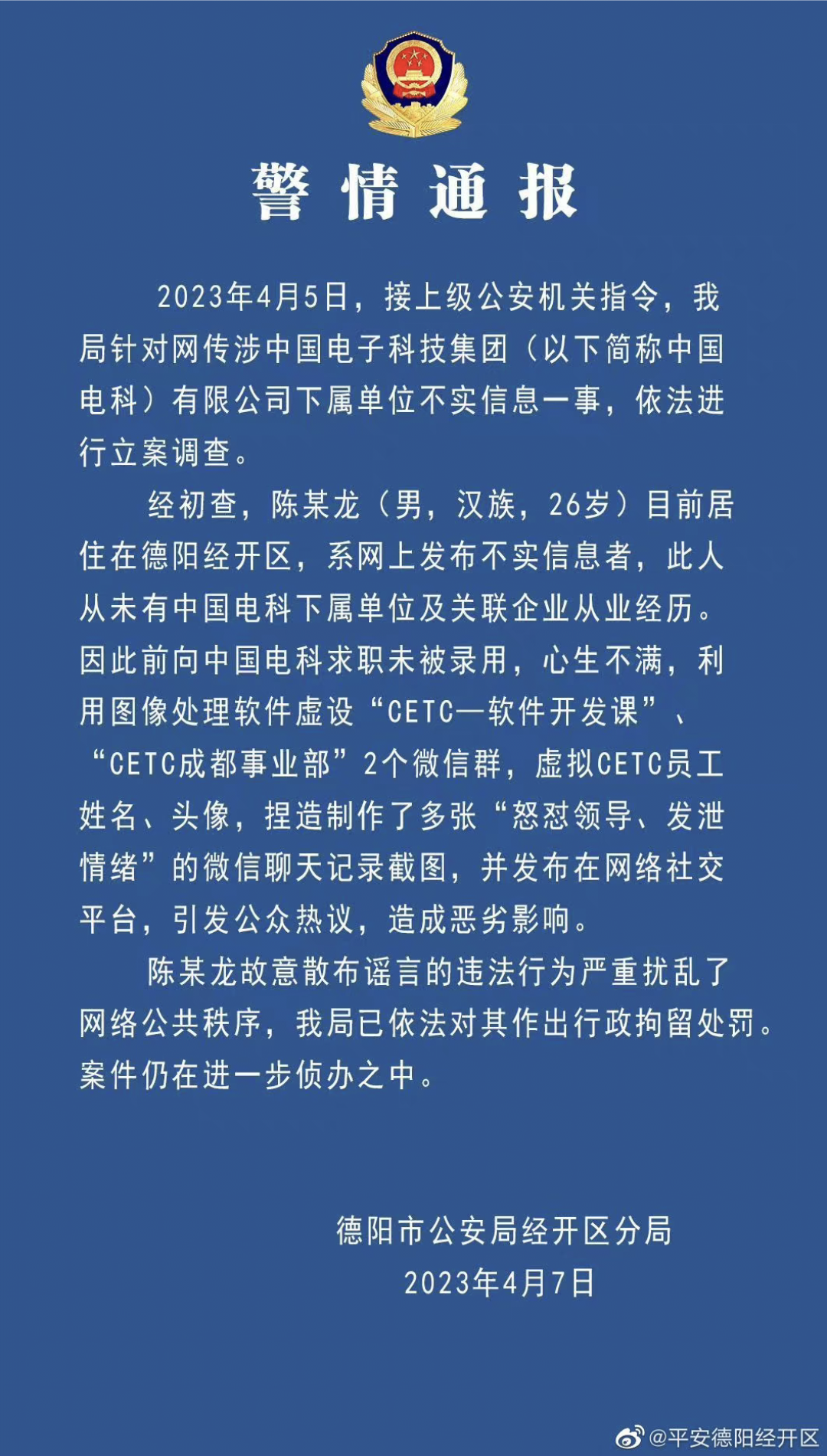 4月7日,大皖新聞報道稱,網(wǎng)傳加班事件當事人陳志龍為四川省德陽市經(jīng)開區(qū)某科技公司員工,德陽市人社局辦公室也回應(yīng)稱“正在進行調(diào)查”。4月7日晚間,四川省德陽市公安局經(jīng)開區(qū)分局通過官方微博發(fā)布警方通報稱,陳某龍從未有中國電科下屬單位及關(guān)聯(lián)企業(yè)從業(yè)經(jīng)歷,其因此前向中國電科求職未被錄用,心生不滿,利用圖像處理軟件虛設(shè)“CETC—軟件開發(fā)課”“CETC成都事業(yè)部”2個微信群,虛擬CETC員工姓名、頭像,捏造制作了多張“怒懟領(lǐng)導、發(fā)泄情緒”的微信聊天記錄截圖,并發(fā)布在網(wǎng)絡(luò)社交平臺,造成惡劣影響。目前陳某龍已被警方行政拘留。4月8日,微博平臺官方表示,已清理此事件中散布不實信息、惡意攻擊國企體制的違規(guī)內(nèi)容5792條,并對“@老c隊長”等9個違規(guī)“自媒體”賬號及253個違規(guī)用戶予以禁言處置。
