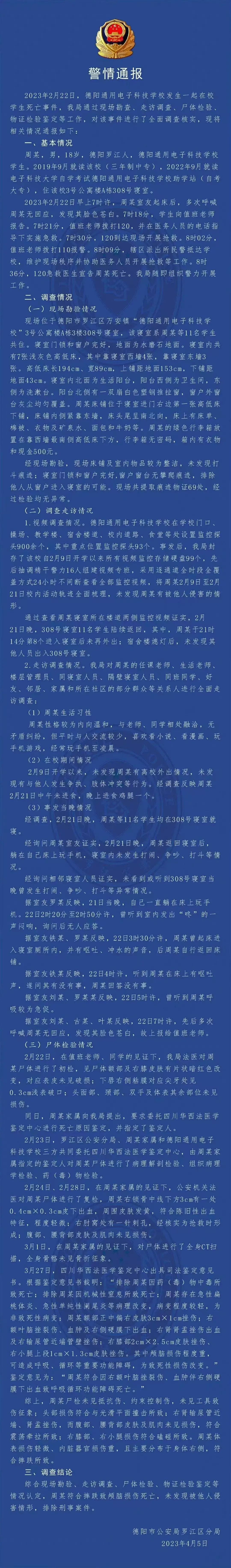 4月5日,“@羅江警方”在微博平臺發(fā)布長篇警情通報,圍繞事件調查情況,詳細披露了警方現場勘查、走訪調查、尸體檢驗、物證檢驗鑒定等工作的具體細節(jié)。通報中提及:警方抽調精干警力16人全面梳理周某自2月9日該校開學后的校內活動軌跡,未發(fā)現周某有被他人侵害的情形;尸檢結果顯示,周某腎部損傷系震蕩牽拉導致,肘部針刺孔為搶救時形成,體表損傷輕微且主要集中于一側,符合摔跌所致;周某多名室友證實,事發(fā)當晚“寢室內曾有‘咚’的一聲悶響”“周某起床嘔吐后自行返回床鋪”等情形,進一步佐證周某系摔跌受傷后自行臥床的結論。