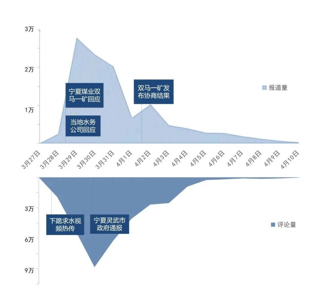 3月29日,部分中央主流媒體發(fā)聲表態(tài):“@中國新聞網”稱“‘缺水’的輿論場需要真相甘霖”;央廣網推出文章《萬畝治沙林被煤礦“斷水”?供水和調查必須馬上到位》,指出當地必須盡快用客觀公正的調查還原真相,給林場主一個交代,給萬畝林場一個交代,也給公眾一個交代。輿論場還曝光一份判決書,顯示寧夏回族自治區(qū)銀川市中院曾作出判決,明確該煤礦占用林地,要求賠償孫國友727.54萬元。另據九派新聞報道,當地水務公司負責人稱,礦場污水處理達標,但是水的鹽分過高澆不了樹。煤礦一方稱,污水處理設備容量比較小,每天只能處理兩千立方,且資金成本太大,不想加大投入。靈武市政府相關人員向媒體表示,正在針對此事協(xié)調處理。當日,“#萬畝樹木被煤礦斷水面臨枯死#”“#水務公司回應萬畝林場主跪地求供水#”等相關微博話題沖上熱搜榜前列,輿情熱度達到峰值。部分網民表示,經歷了沙塵暴,才能真正明白造林治沙的好處和難處,“不能讓好人流汗流淚又流血”。微博大V“@胡錫進”也呼吁,希望不用下跪崩潰引起巨大輿情也能正常解決。
