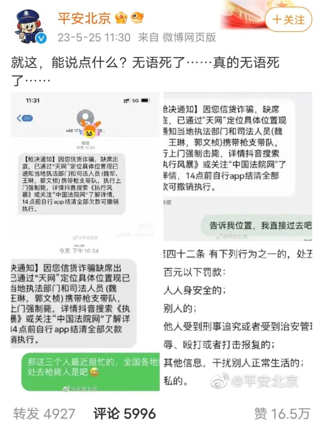 近日,多名網(wǎng)民曬出圖片稱收到“強(qiáng)制槍斃”詐騙短信,引發(fā)一小波關(guān)注。5月25日11時(shí)許,北京市公安局官方微博“@平安北京”發(fā)布一則為幾張?jiān)p騙短信截圖的微博,圖片內(nèi)容相同皆寫著:“因您信貸詐騙,缺席出庭,已通過‘天網(wǎng)’定位具體位置,現(xiàn)已通知當(dāng)?shù)貓?zhí)法部門和司法人員(魏軍,王琳,郭文禎)攜帶槍支帶隊(duì),執(zhí)行上門強(qiáng)制槍斃,詳情抖音搜索《執(zhí)行風(fēng)暴》或關(guān)注‘中國法院網(wǎng)’了解詳情,14點(diǎn)前自行app結(jié)清全部欠款可撤銷執(zhí)行?!睂Υ耍癅平安北京”直言道“就這,能說點(diǎn)什么?真的無語死了”。隨后,還配了治安管理處罰法的截圖,指出發(fā)短信恐嚇?biāo)怂媾R的處罰。該則微博迅速引發(fā)大量網(wǎng)民圍觀,相關(guān)微博轉(zhuǎn)評超過1.1萬次,點(diǎn)贊16.5萬次。多數(shù)網(wǎng)民表示騙子侮辱人智商,并留言調(diào)侃稱“笑死,現(xiàn)在槍決都能上門服務(wù)了”“這三個(gè)人挺忙,全國各地到處去槍斃人”。
