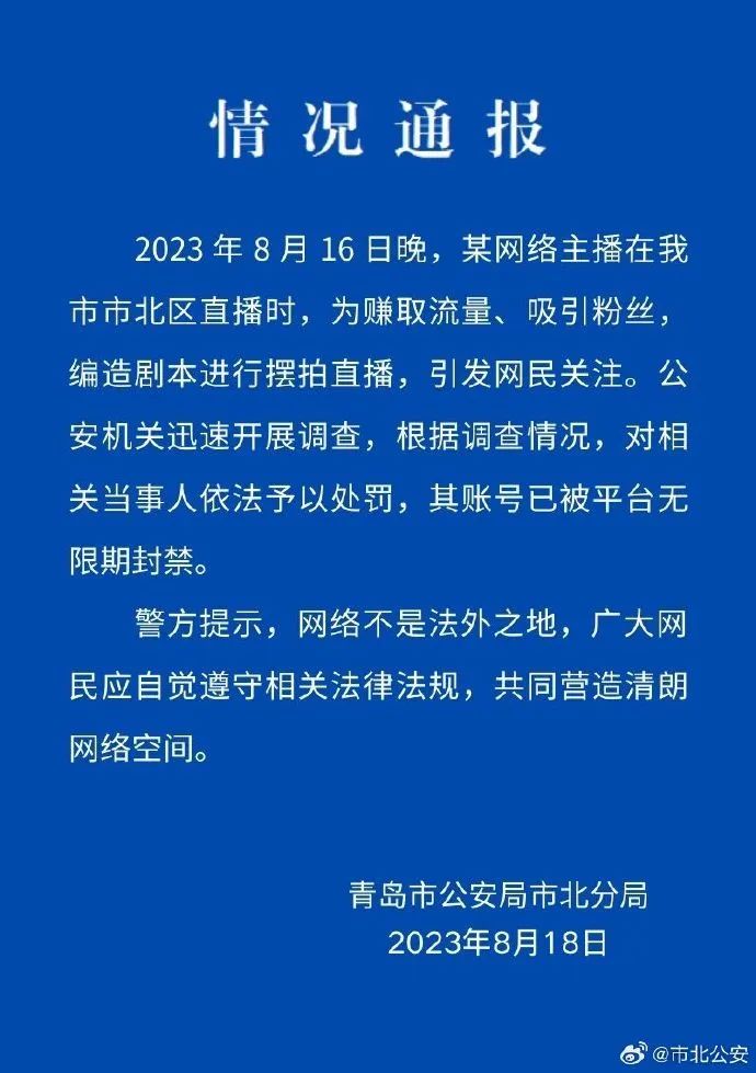 8月18日,青島市公安局市北分局微博賬號(hào)“@市北公安”通報(bào)稱,某網(wǎng)絡(luò)主播在青島市市北區(qū)直播時(shí),為賺取流量、吸引粉絲,編造劇本進(jìn)行擺拍直播。公安機(jī)關(guān)對(duì)相關(guān)當(dāng)事人依法予以處罰,其賬號(hào)已被平臺(tái)無限期封禁。“#二驢#”“#警方通報(bào)網(wǎng)傳二驢直播被綁架#”等多個(gè)話題閱讀量近6.7億。輿論對(duì)此結(jié)果表示認(rèn)同,評(píng)論稱“山東警方果斷調(diào)查處置,結(jié)果大快人心”。
