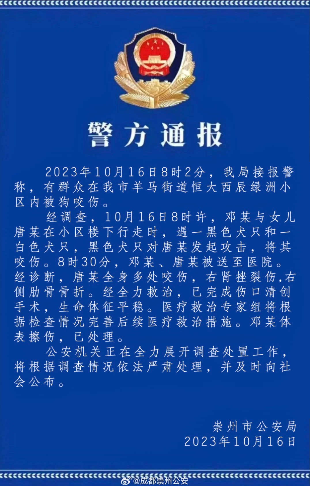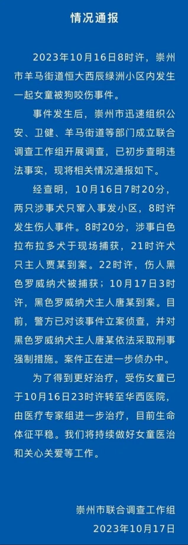 事發(fā)當(dāng)日17時(shí)許,崇州公安發(fā)布首份通報(bào),稱被咬女童生命體征平穩(wěn),正全力展開調(diào)查處置工作。輿論場中不少網(wǎng)民探究事發(fā)原因,認(rèn)為養(yǎng)犬規(guī)定落實(shí)不到位,導(dǎo)致遛狗不牽繩、飼養(yǎng)烈性犬等亂象出現(xiàn)。10月17日,據(jù)受傷女童母親透露,涉事黑犬已被找到,警方還在排查狗主人。另有媒體報(bào)道稱,成都禁養(yǎng)22種烈性犬不包括羅威納,部分網(wǎng)民對警方工作效率表達(dá)不滿情緒。