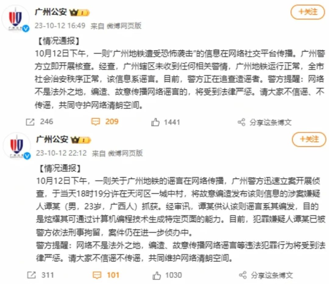 【典型案例】10月12日下午,一則“廣州地鐵遭受恐怖襲擊”的信息在網(wǎng)絡(luò)社交平臺傳播。此則消息以截圖的形式被傳播,圖片顯示作者為“廣州市公安局”,內(nèi)容稱“10月12日下午14時,廣州市地鐵3號線珠江新城站,3名恐怖分子攜帶TNT炸藥在地鐵搶劫,走火發(fā)生意外,產(chǎn)生劇烈爆炸,造成多方傷亡”。當(dāng)日16時49分,官方微博“@廣州公安”發(fā)布通報進行辟謠。同日22時12分,“@廣州公安”再次發(fā)布通報稱,當(dāng)天18時19分許在天河區(qū)一城中村,警方將故意編造發(fā)布該則信息的涉案嫌疑人譚某抓獲。經(jīng)審訊,譚某供認該則謠言系其編發(fā),目的是炫耀其可通過計算機編程技術(shù)生成特定頁面的能力。