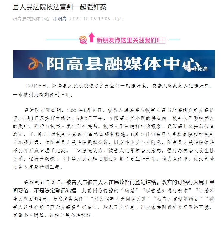 2023年12月25日13時許,陽高縣融媒體中心微信公眾號“和陽高”通報此案審理情況。通報指出,經(jīng)法院審理查明,2023年1月30日,被告人與被害人經(jīng)當(dāng)?shù)啬郴榻樗榻B認(rèn)識。5月1日雙方訂立婚約。5月2日下午,在陽高縣某小區(qū)的房屋內(nèi),被告人不顧被害人反抗,強行與被害人發(fā)生了性關(guān)系。被害人于當(dāng)晚打電話報警。經(jīng)陽高縣公安局偵查取證,于5月5日對被告人采取刑事拘留強制措施。經(jīng)相關(guān)部門查證,被告人與被害人未在民政部門登記結(jié)婚。雙方的訂婚行為屬于民間習(xí)俗,不是法定登記結(jié)婚。此前,此前網(wǎng)絡(luò)傳播的“騙婚”“以告強奸進行敲詐”等多個傳言,均系不實信息。這一通報初步回應(yīng)了多個輿論關(guān)切點,網(wǎng)民觀點開始出現(xiàn)扭轉(zhuǎn),部分網(wǎng)民指出訂婚不等于同意發(fā)生性關(guān)系。