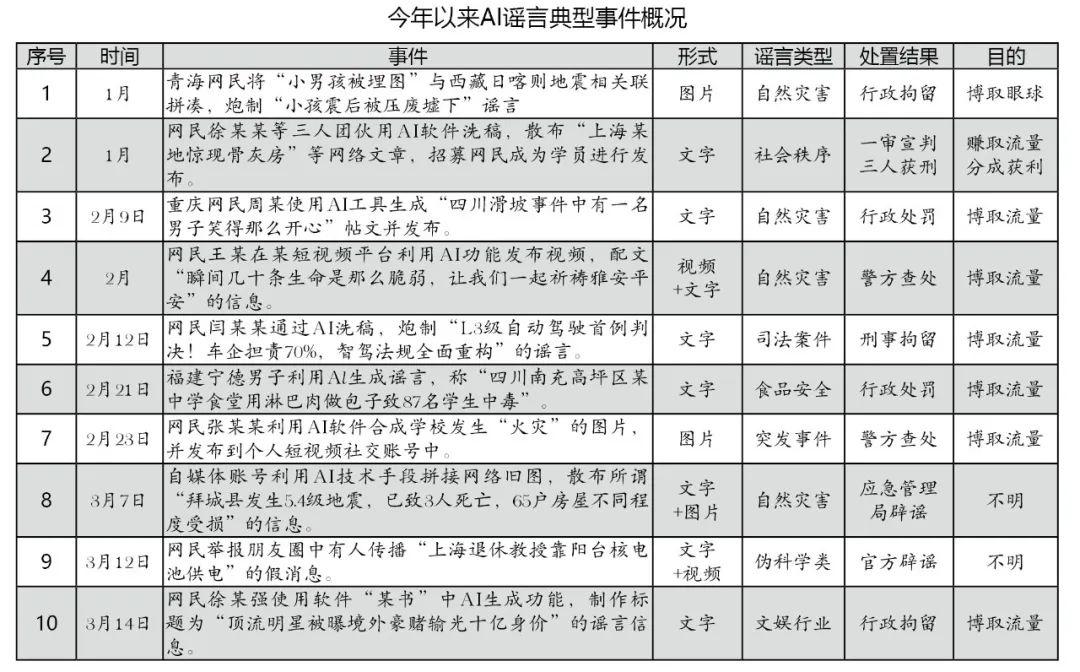 10起典型案例中,有4起AI謠言與自然災(zāi)害相關(guān),包括地震、山體滑坡等;2起謠言涉及食品安全和突發(fā)事件,分別為“四川某中學(xué)食堂用淋巴肉做包子致87名學(xué)生中毒”和“某地學(xué)校發(fā)生火災(zāi)”;還有4起謠言分別涉及偽科學(xué)、文娛行業(yè)、社會秩序和司法案件四個方面。AI謠言表現(xiàn)形式較多,大多通過微博、微信、短視頻等社交媒體渠道擴(kuò)散,并以文字、圖片、視頻形式單一或“搭配”傳播,比如“西藏定日縣地震一小孩被壓廢墟”謠言形式為圖片,“上海退休教授靠陽臺核電池供電”謠言則是以“文字+視頻”的形式傳播。造謠動機(jī)方面,有8起事件明確提到造謠者是為了蹭熱點、賺取流量收益,可見流量經(jīng)濟(jì)仍然是AI謠言存在的底層邏輯。10起事件中,有2起事件被官方辟謠,但沒有其他情況通報,其余8起均有明確處理結(jié)果。處置結(jié)果方面,10起事件中有5起事件的造謠者被公安機(jī)關(guān)給予行政處罰或行政拘留,有2起事件進(jìn)入到司法流程,網(wǎng)民閆某某因刻意炒作“國內(nèi)首例智能駕駛致死案”,被屬地警方刑事拘留;網(wǎng)民徐某某等3人散布“上海某地驚現(xiàn)骨灰房”等謠言,獲利數(shù)額較大,被上海當(dāng)?shù)胤ㄔ阂苑欠ń?jīng)營罪判處有期徒刑一年十個月不等。