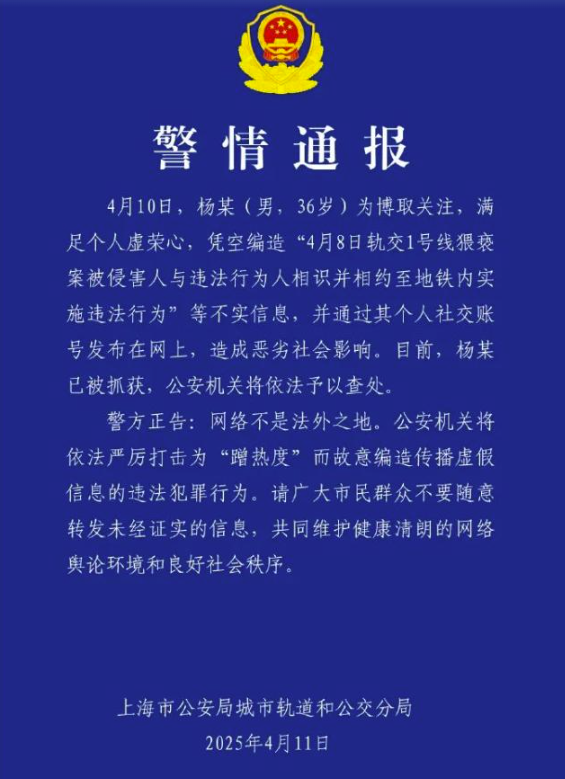 4月11日9時(shí)29分,“@軌交幺幺零”再發(fā)通報(bào)稱,男子楊某為博取關(guān)注,憑空編造“軌交1號(hào)線猥褻案男女雙方相識(shí)”謠言,發(fā)布到網(wǎng)上后造成惡劣影響,目前已被抓獲。官方通報(bào)再掀一波討論熱潮,微博轉(zhuǎn)評(píng)2萬(wàn)余次、點(diǎn)贊超26萬(wàn)次,“進(jìn)去得好”“還是官方速度快”等評(píng)論獲得網(wǎng)民點(diǎn)贊認(rèn)同。紅星新聞、極目新聞等媒體發(fā)文稱,“造黃謠和性騷擾都該人人喊打”;部分網(wǎng)民言論涉及性別對(duì)立話題,如“出手相助的是女的,猥褻造謠的都是男的”。截至4月17日12時(shí),該事件相關(guān)輿情信息量超8萬(wàn)條,“#上海地鐵一男子疑脫褲猥褻女乘客#”“#上海辟謠地鐵猥褻事件當(dāng)事人相識(shí)#”等數(shù)十個(gè)關(guān)聯(lián)微話題累計(jì)閱讀量超6億。