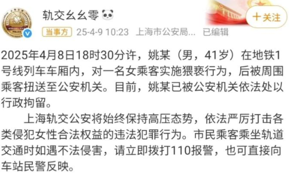 4月9日上午,多段網(wǎng)傳視頻引發(fā)關(guān)注,視頻顯示,上海地鐵一名女乘客疑似被猥褻,對(duì)身邊男子哭喊道“你把褲子脫了并弄到我身上”,同車女子稱“姐妹,我錄了視頻,我陪你去”。“@荔枝新聞”等媒體跟進(jìn)報(bào)道,上海地鐵客服工作人員稱確有其事,網(wǎng)民痛斥男子“變態(tài)”“垃圾”。當(dāng)日10時(shí)23分,上海市公安局城市軌道和公交分局官微“@軌交幺幺零”發(fā)通報(bào)稱,“4月8日18時(shí)30分許,姚某在地鐵1號(hào)線列車車廂內(nèi),對(duì)一名女乘客實(shí)施猥褻行為,被周圍乘客扭送至公安機(jī)關(guān)。目前,姚某已被公安機(jī)關(guān)依法處以行政拘留”。多數(shù)網(wǎng)民稱贊警方行動(dòng)快速;部分網(wǎng)民表示不滿,認(rèn)為行政拘留處罰較輕。4月10日,男子所在的工作單位發(fā)布公告,宣布將其開除。