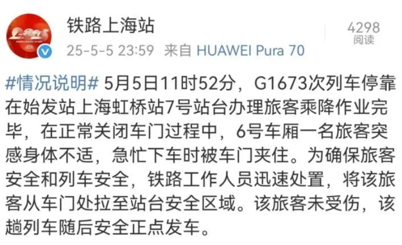 5月5日,網(wǎng)傳上海虹橋高鐵站又現(xiàn)“女子阻礙高鐵關(guān)門”事件。視頻顯示,有目擊者稱,女子此舉是為了等后面的老太太。當日深夜,“@鐵路上海站”通報稱,當事旅客因突感身體不適,急忙下車時被門夾住,工作人員迅速將其拉至安全區(qū)域。該旅客未受傷,該趟列車隨后安全正點發(fā)車。通報發(fā)出后,多數(shù)網(wǎng)民表示理解,但也有網(wǎng)民并不認同上海鐵路方的處理方式,認為如果以后都可以用這些理由,會引發(fā)更多人效仿。