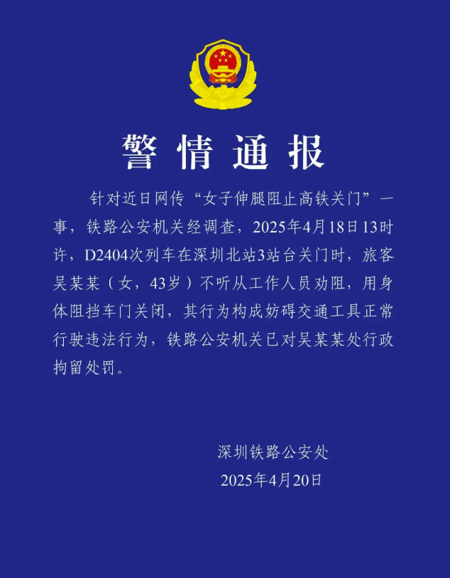 4月18日,一段“女子伸腿阻止高鐵關(guān)門”的視頻在網(wǎng)絡上引起熱議。視頻中,一名女性旅客強行用身體阻攔車門,兩名工作人員極力制止卻未能成功,直到三名同行人上車才離開車門,隨后列車關(guān)門駛離。4月19日,“@廣鐵集團深圳北火車站”發(fā)布情況說明,證實網(wǎng)傳視頻屬實,并稱未造成列車晚點,相關(guān)部門已介入調(diào)查。輿論要求嚴懲行為人呼聲較高,部分網(wǎng)民不滿工作人員制止不力,對相關(guān)法律規(guī)章制度未嚴格執(zhí)行。4月20日,深圳鐵路公安處官方微博通報稱,旅客吳某某行為構(gòu)成妨礙交通工具正常行駛違法行為,已被行政拘留。主流輿論點贊警方處置及時,并圍繞“攔門事件何時休”展開討論。如中國網(wǎng)發(fā)文建議,修訂《鐵路安全管理條例》,明確阻礙發(fā)車的量化處罰標準,如按延誤時長階梯式罰款。上觀新聞、紅網(wǎng)發(fā)文稱,鐵路部門應加大處罰力度,將“危害安全行為”納入個人征信系統(tǒng)、列入限行“黑名單”,形成更強的震懾效應。