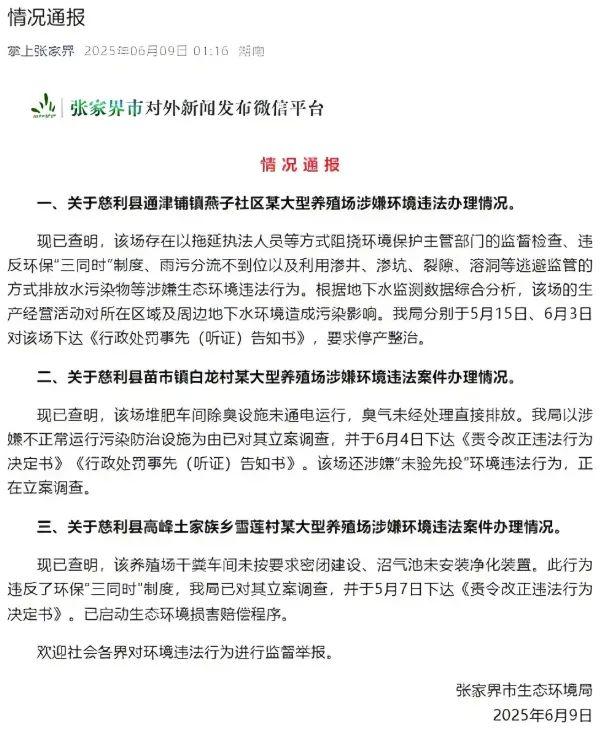 5月22日,“慈利發(fā)布”發(fā)文稱,近期發(fā)現(xiàn)長潭河電站大壩上游出現(xiàn)大面積渾濁污水,初步排查是從楊家坡溶洞溢流至溇水所致,執(zhí)法人員正在排查周邊區(qū)域環(huán)境違法行為。5月25日,“慈利發(fā)布”通報工作進展,稱已經(jīng)對多家養(yǎng)殖場指導立行立改,同時對涉嫌失職瀆職的相關(guān)責任人員同步啟動責任倒查。5月28日,張家界市生態(tài)環(huán)境局工作人員向媒體表示,他們很早就接到了對溶洞排污事件的投訴,從4月中旬開始一直在進行調(diào)查處理,最新調(diào)查進展將及時通報。5月29日,慈利縣再次發(fā)布情況通報稱,當?shù)厣鷳B(tài)環(huán)境局已對涉嫌違法排污的3家養(yǎng)殖戶立案調(diào)查。經(jīng)水質(zhì)監(jiān)測,慈利縣溇水飲用水源地水質(zhì)穩(wěn)定達到地表水Ⅱ類標準。