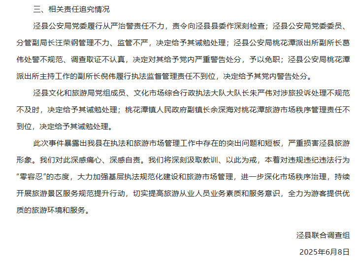 6月7日0時(shí)許,涇縣文化和旅游局發(fā)布情況通報(bào)稱,已成立工作專班進(jìn)行全面調(diào)查,向游客蔡某及其家人致歉。但輿論怒火并未完全平息,不少網(wǎng)民表示不能僅讓文旅部門“背鍋”,當(dāng)?shù)毓矙C(jī)關(guān)應(yīng)深入調(diào)查、嚴(yán)肅問責(zé)。據(jù)微信公眾號(hào)“涇縣人民政府發(fā)布”7日晚消息,涇縣召開全縣旅游市場秩序整治工作會(huì)議,會(huì)議要求“聚焦短板弱項(xiàng),抓好旅游市場秩序整治”等。