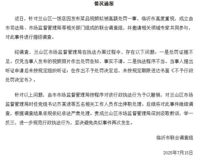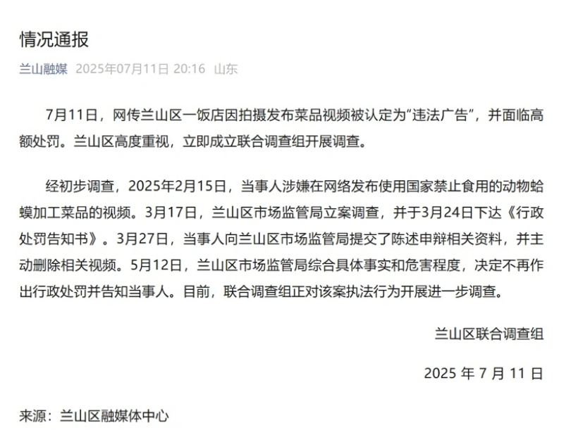 臨沂市蘭山區(qū)聯(lián)合調(diào)查組關(guān)于“一飯店因發(fā)布菜品視頻擬被高額處罰”事件的情況通報(bào)