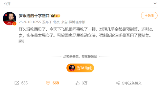 回溯這場討論的源頭,始于羅永浩的一篇微博。9月10日下午,“@羅永浩的十字路口”發(fā)博稱,“好久沒吃西貝了,今天下飛機跟同事吃了一頓發(fā)現(xiàn)幾乎全都是預制菜,還那么貴,實在是太惡心了。希望國家盡早推動立法,強制飯館注明是否用了預制菜?!碧陌l(fā)出后迅速引起網(wǎng)民關(guān)注。