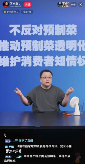 9月12日晚間,羅永浩在多平臺同步直播,開播僅10分鐘其抖音直播間觀看人數(shù)已超10萬。羅永浩在直播中以西貝使用的“凍海鱸魚”舉例,認為食用這種經(jīng)過深度工業(yè)化處理的食材與大眾去餐廳追求新鮮的初衷顯然不符,且稱西貝“是所有賣預制菜餐廳里賣最貴的”。羅永浩強調(diào),預制菜還沒有正式的國家標準,不反對預制菜,而是主張“推動中國預制菜行業(yè)透明化、保障消費者的知情權(quán)”,并點贊了餐飲品牌老鄉(xiāng)雞公示菜品區(qū)分“現(xiàn)做”“半預制”“預制”加工等級的舉措。