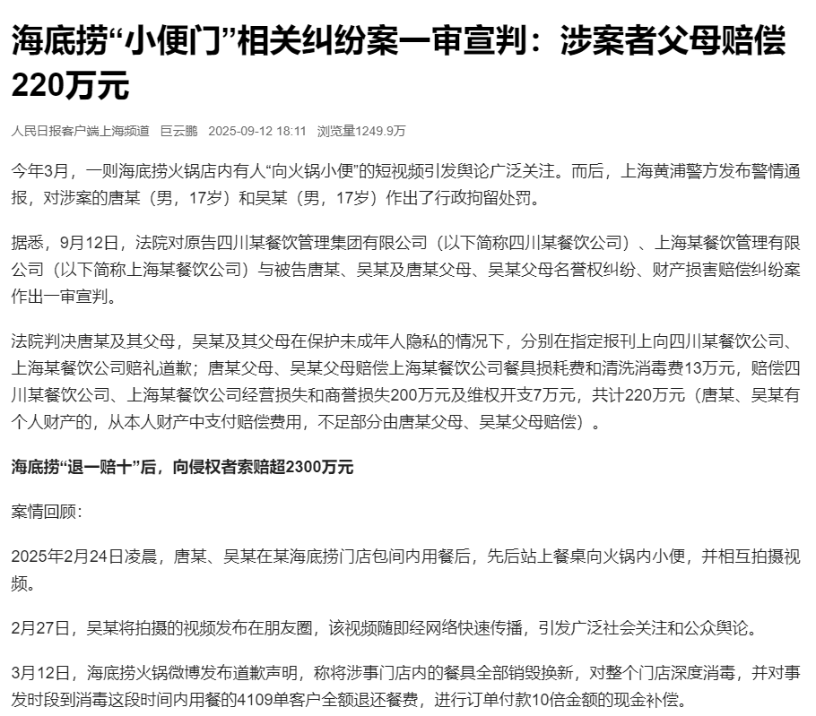 半年前引發(fā)廣泛討論的海底撈“小便門”事件近日迎來新進(jìn)展。據(jù)人民日報客戶端報道,9月12日,上海市黃浦區(qū)人民法院對海底撈“小便門”相關(guān)糾紛案作出一審判決,肇事者唐某、吳某及各自父母在保護(hù)未成年人隱私的情況下,分別在指定報刊上賠禮道歉;賠償餐具損耗費(fèi)和清洗消毒費(fèi)13萬元、經(jīng)營損失和商譽(yù)損失200萬元及維權(quán)開支7萬元,共計220萬元,唐某、吳某有個人財產(chǎn)的,從本人財產(chǎn)中支付賠償費(fèi)用,不足部分由唐某父母、吳某父母賠償。