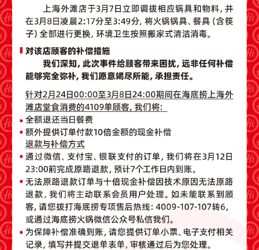 (海底撈對消費(fèi)者“退一賠十”聲明截圖 來源:海底撈火鍋官方微博)