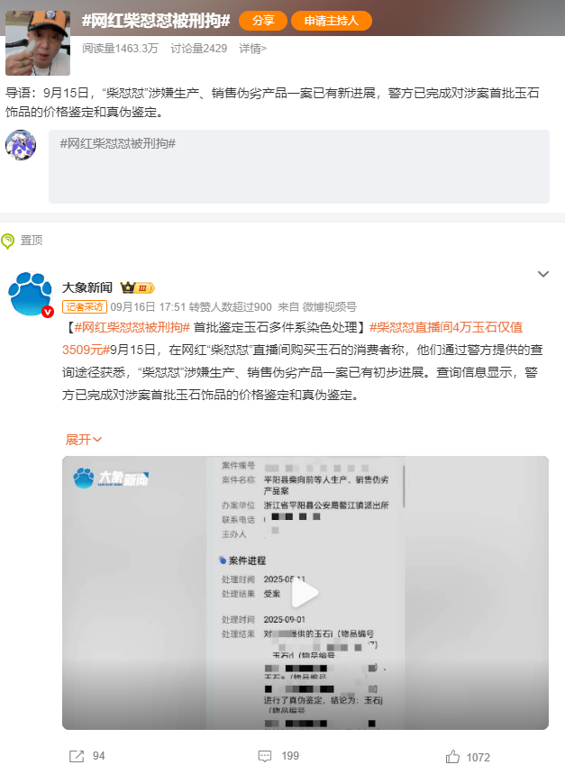 (微博話題“#柴懟懟被刑拘#”截圖)
