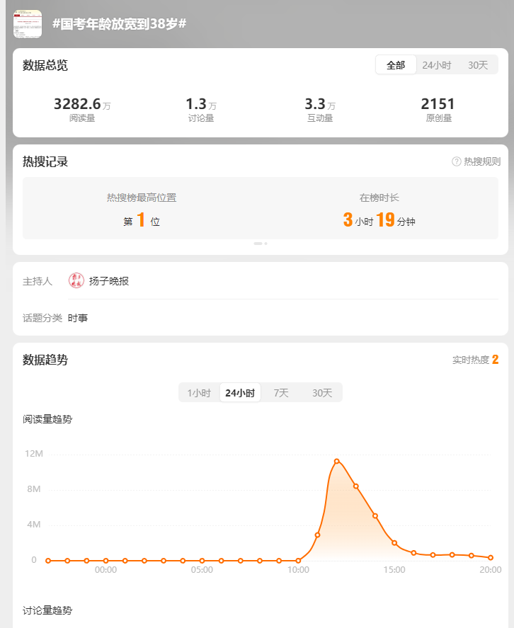 隨后,該公告內(nèi)容被新華社、北京日報(bào)、揚(yáng)子晚報(bào)、極目新聞等多家媒體報(bào)道,迅速引發(fā)輿論關(guān)注。微博話題“#國考年齡放寬到38歲#”迅速登上熱搜榜最高位置。