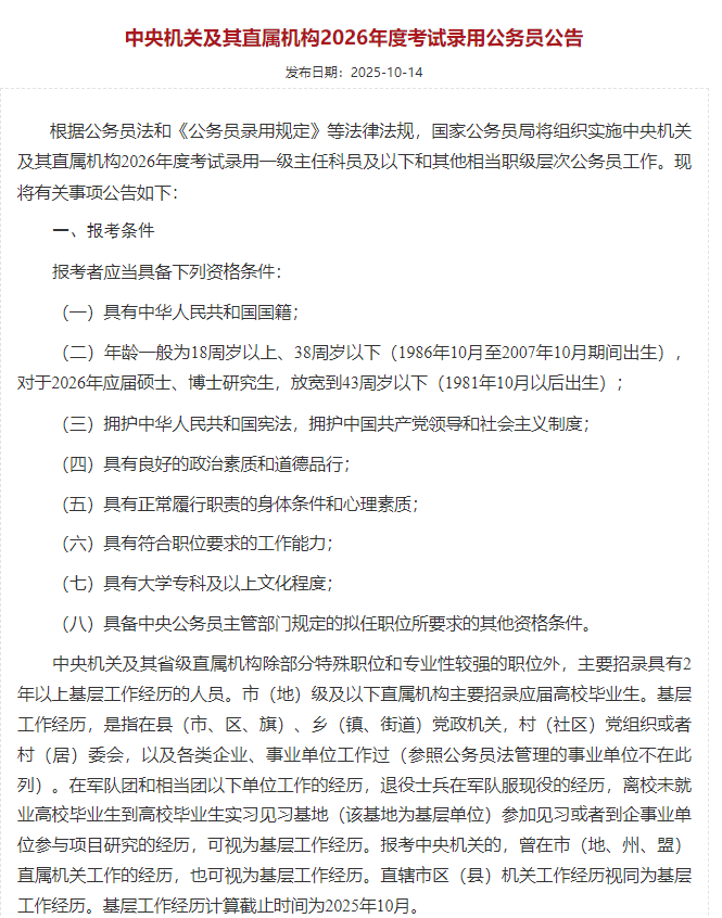 10月14日,國家公務(wù)員局網(wǎng)站發(fā)布《中央機(jī)關(guān)及其直屬機(jī)構(gòu)2026年度考試錄用公務(wù)員公告》,公告顯示報(bào)考條件:年齡一般為18周歲以上、38周歲以下(1986年10月至2007年10月期間出生),對于2026年應(yīng)屆碩士、博士研究生,放寬到43周歲以下(1981年10月以后出生)。這意味著,國家公務(wù)員報(bào)考者年齡放寬至38周歲以下,打破過去35周歲上限。此外,對于應(yīng)屆生碩士、博士研究生,年齡更是放寬至43周歲以下。