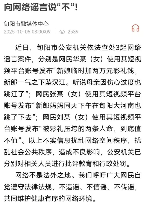 10月5日,旬陽市融媒體中心發(fā)布消息稱,近日,旬陽市公安機關(guān)依法查處3起網(wǎng)絡(luò)謠言案件,三名網(wǎng)民使用短視頻平臺賬號發(fā)布“新郎婚禮前跳河”事件不實信息,擾亂網(wǎng)絡(luò)空間秩序和社會公共秩序,造成不良影響,公安機關(guān)已分別對相關(guān)人員進行批評教育和行政處罰。隨后,中國新聞社、觀察者網(wǎng)、《法治日報》等媒體轉(zhuǎn)發(fā)報道。此次回應(yīng)雖引發(fā)了輿論對網(wǎng)絡(luò)謠言的深思,但仍未能驅(qū)散公眾心頭的疑云。紅網(wǎng)評論道,官方調(diào)查需要時間,而信息真空期恰恰為謠言的滋生提供了土壤。紅星新聞評論認為,無論原因為何,都令人痛心。此時,理性的圍觀和善意的等待,遠比迫不及待的“斷案”更有價值。我們應(yīng)該給予足夠的尊重和空間,等待權(quán)威的、詳盡的調(diào)查結(jié)果?!缎戮﹫蟆吩u論指出,這起新郎跳河事件具備足夠的公共性,有必要把事件的前因后果說得更清楚明白一些。否則,各種傳言甚至謠言紛紛而起,不利于網(wǎng)絡(luò)空間和社會秩序的維護。多數(shù)網(wǎng)民也持相同觀點,認為“掩蓋必然引發(fā)猜測”,并持續(xù)追問事件真相,呼吁官方給出更具說服力的詳實通報。