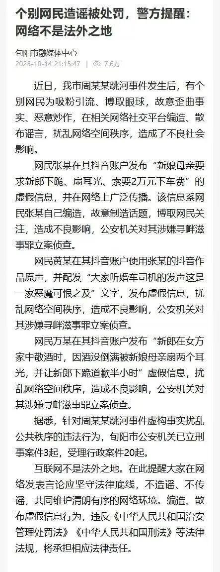同日,陜西安康旬陽市融媒體中心發(fā)布消息稱,近日,旬陽市周某某跳河事件發(fā)生后,有個別網(wǎng)民為吸粉引流、博取眼球,故意歪曲事實、惡意炒作,在相關(guān)網(wǎng)絡(luò)社交平臺編造、散布謠言,擾亂網(wǎng)絡(luò)空間秩序,造成了不良社會影響。網(wǎng)民張某、黃某、萬某在短視頻賬戶發(fā)布相關(guān)虛假信息,造成不良影響,已被公安機關(guān)以涉嫌尋釁滋事罪立案偵查。針對周某某跳河事件虛構(gòu)事實擾亂公共秩序的違法行為,旬陽市公安機關(guān)已立刑事案件3起,受理行政案件20起。輿論普遍表示,官方展現(xiàn)了治理謠言的決心,認為制止謠言最好的方法就是公布調(diào)查結(jié)果。