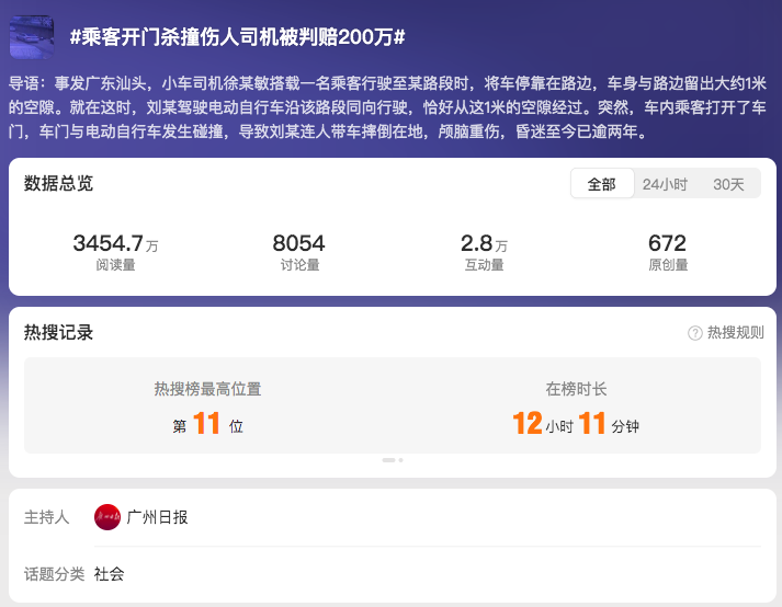 此案被報道后,環(huán)球網(wǎng)、上觀新聞、《廣州日報》等媒體接力傳播,推高輿情熱度,微博話題“#乘客開門殺撞傷人司機(jī)被判賠200萬#”登上熱搜榜第11位。