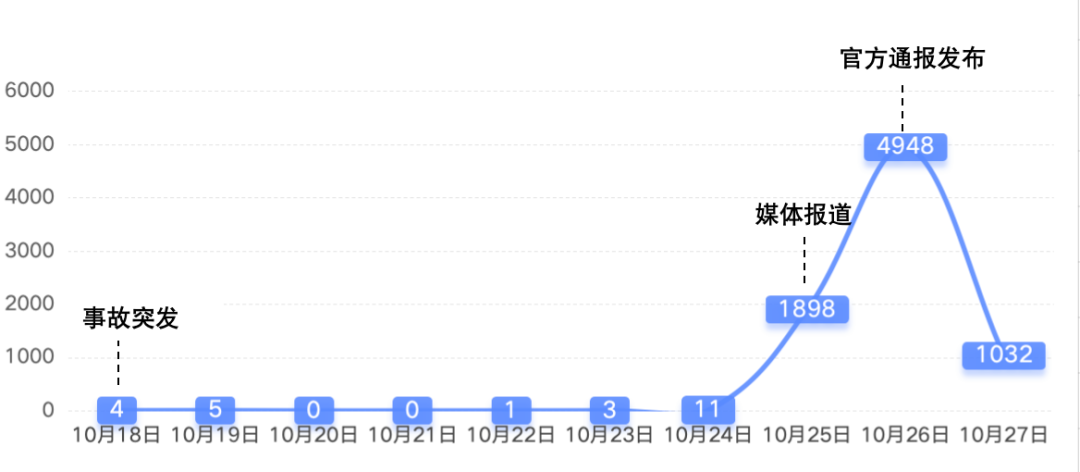 自10月18日起,少量網(wǎng)民發(fā)布事故信息引發(fā)關(guān)注,25日媒體介入報(bào)道推動(dòng)輿情熱度快速攀升,官方發(fā)布通報(bào)后輿情信息量觸達(dá)頂峰。截至10月28日10時(shí),相關(guān)信息8061條,相關(guān)微博話題閱讀量累計(jì)達(dá)1.15億。