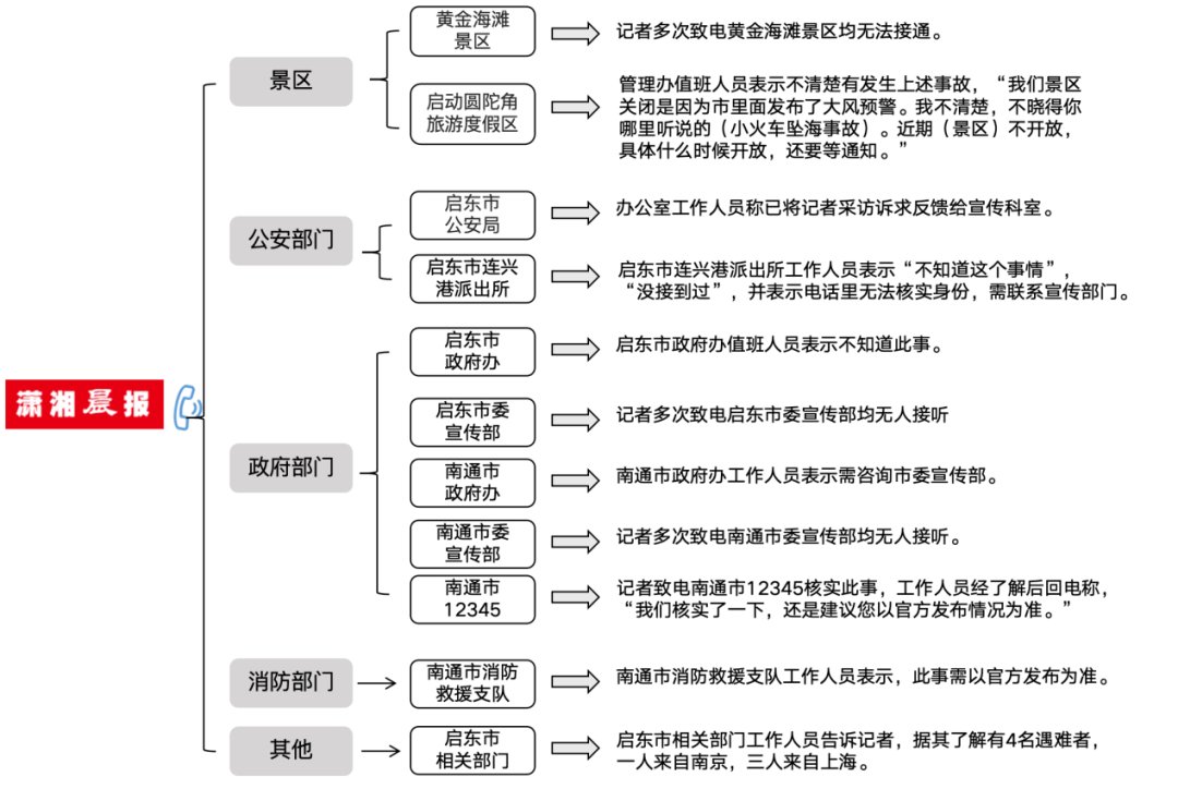10月25日13時(shí)許,瀟湘晨報(bào)報(bào)道稱,江蘇一海灘景區(qū)觀光小火車疑發(fā)生事故致多人傷亡。記者向景區(qū)及市縣十余個(gè)部門致電,但回應(yīng)均為“不清楚”“不知道此事”“等官方發(fā)布通知”“聯(lián)系宣傳部門”(回復(fù)情況見下圖)。啟東市相關(guān)部門工作人員表示,據(jù)其了解有4名遇難者,一人來自南京,三人來自上海。