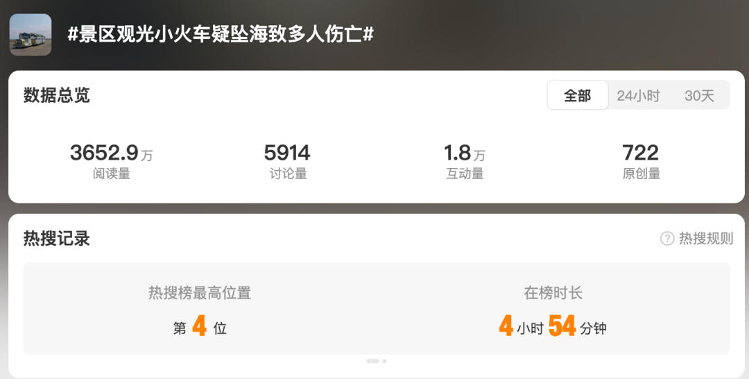 10月18日起,有網(wǎng)民通過微博、小紅書爆料稱,江蘇南通啟東市黃金海灘景區(qū)附近發(fā)生一起觀光小火車墜海事故,有人遇難。10月18日17時(shí)51分,微信公眾號(hào)“江蘇黃金海灘景區(qū)”發(fā)布公告稱,黃金海灘景區(qū)臨時(shí)閉園,開園時(shí)間另行通知。10月24日,南通市自媒體“江海通報(bào)”發(fā)文稱,“數(shù)日前江蘇一地小火車墜海致多人死亡,當(dāng)?shù)厥锌h兩級(jí)政府及文旅部門尚未發(fā)布通報(bào)或辟謠,網(wǎng)絡(luò)平臺(tái)出現(xiàn)‘啟東小火車墜?!畣|小火車翻車’等相關(guān)搜索熱詞,但一直搜索不到任何對(duì)應(yīng)結(jié)果?!庇嘘P(guān)該事故的信息零散出現(xiàn),部分網(wǎng)民追問事故發(fā)生的具體時(shí)間及傷亡人數(shù)。
