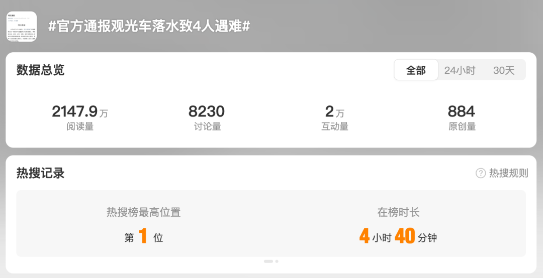 央視新聞、九派新聞、紅星新聞等媒體轉(zhuǎn)發(fā)通報(bào)內(nèi)容,微博話題“#江蘇啟東觀光車事故4人遇難#”“#江蘇觀光車落水相關(guān)責(zé)任人已被控制#”“#觀光車落水的度假區(qū)剛完成安全檢查#” 再次登上熱搜榜。
