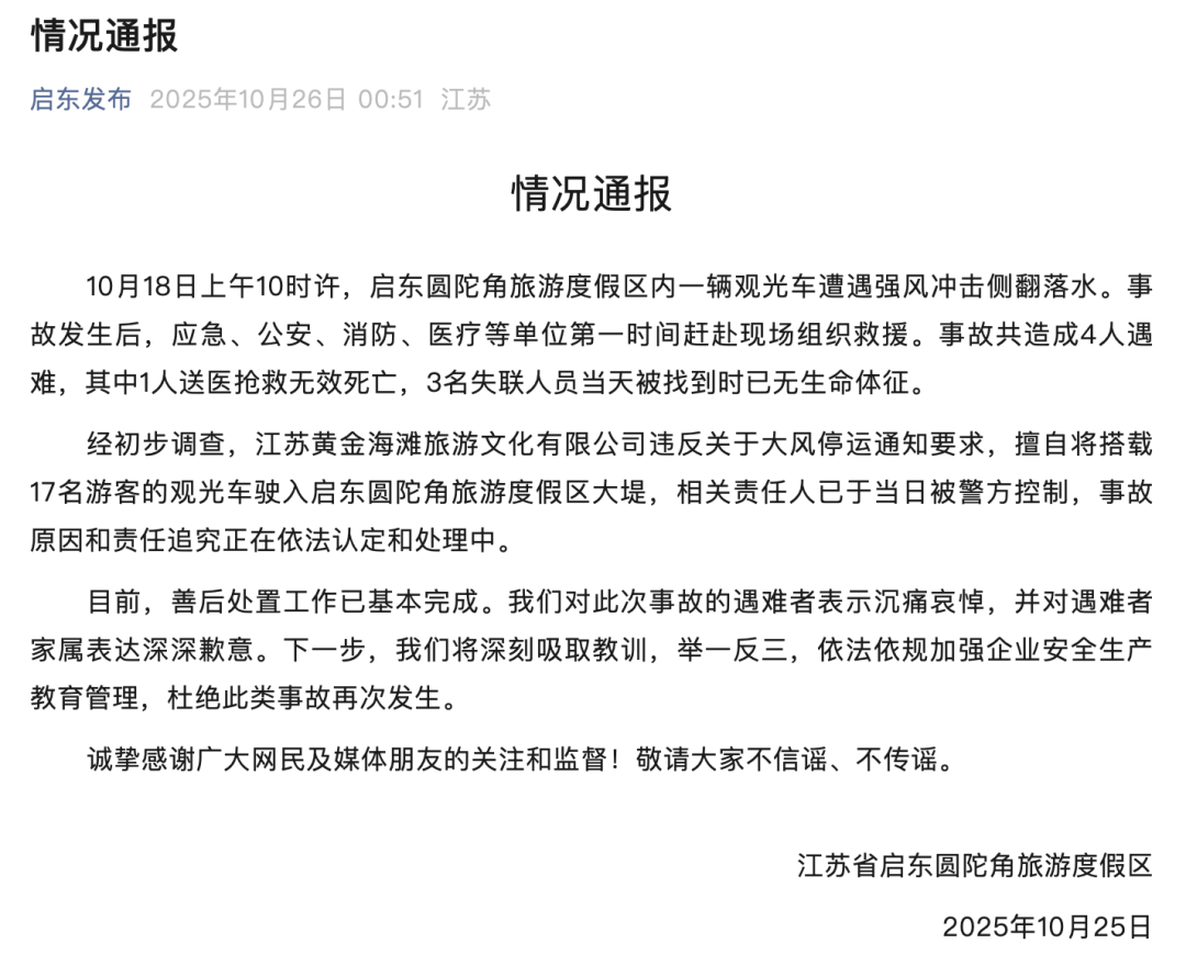 10月26日凌晨,啟東市委宣傳部官方公眾號(hào)“啟東發(fā)布”通報(bào)稱:10月18日上午10時(shí)許,啟東圓陀角旅游度假區(qū)內(nèi)一輛觀光車遭遇強(qiáng)風(fēng)沖擊側(cè)翻落水。事故發(fā)生后,應(yīng)急、公安、消防、醫(yī)療等單位第一時(shí)間趕赴現(xiàn)場(chǎng)組織救援。事故共造成4人遇難,其中1人送醫(yī)搶救無效死亡,3名失聯(lián)人員當(dāng)天被找到時(shí)已無生命體征。經(jīng)初步調(diào)查,江蘇黃金海灘旅游文化有限公司違反關(guān)于大風(fēng)停運(yùn)通知要求,擅自將搭載17名游客的觀光車駛?cè)雴|圓陀角旅游度假區(qū)大堤,相關(guān)責(zé)任人已于當(dāng)日被警方控制,事故原因和責(zé)任追究正在依法認(rèn)定和處理中。目前,善后處置工作已基本完成。