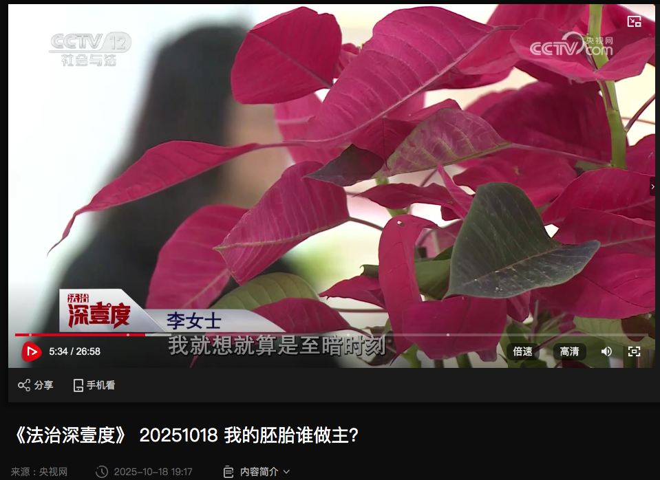 10月18日,央視社會與法頻道《法治深壹度》節(jié)目播發(fā)專題報道《我的胚胎誰做主?》,報道一起喪偶婦女輔助生殖權(quán)益案。據(jù)介紹,福建李女士在丈夫不幸去世后,希望利用夫妻二人在醫(yī)院冷凍保存的胚胎繼續(xù)實施移植手術(shù),但醫(yī)院鑒于醫(yī)學倫理問題拒絕了她的請求。隨后李女士將醫(yī)院起訴至法院,一審和二審均被駁回。直至2022年6月,福建省高級人民法院再審認為,李女士要求醫(yī)院為其實施胚胎移植手術(shù)生育二胎有充分的法律依據(jù),并且還能在精神上撫慰雙方的老人,最終判決醫(yī)院繼續(xù)履行合同,為李女士實施胚胎移植手術(shù)。該報道采訪到李女士本人、醫(yī)院代理律師、法學專家及法官,全面回顧李女士個人遭遇、情感動機以及案件背后的法理爭議。