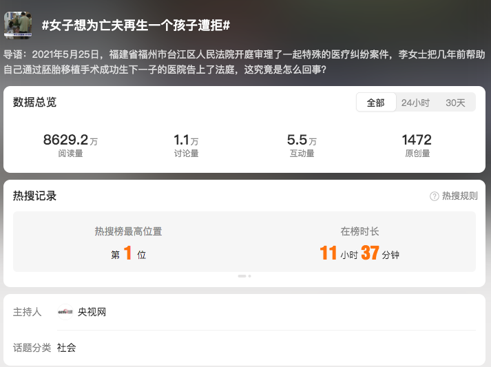 10月28日晚,“@央視網(wǎng)”官方微博發(fā)出26分鐘的報道視頻,摘取報道引言內(nèi)容,并設(shè)置“#女子用亡夫胚胎求試管二胎遭拒#”“#女子想為亡夫再生一個孩子遭拒#”話題,將該案引入輿論視野,引發(fā)網(wǎng)民討論。后續(xù)不斷有“南方都市報”“新浪新聞”“生活幫”等媒體短視頻賬號發(fā)布該報道切片視頻,關(guān)注度隨之升溫。10月29日,微博話題“#女子用亡夫胚胎求試管二胎遭拒#”沖上熱搜榜第1位。